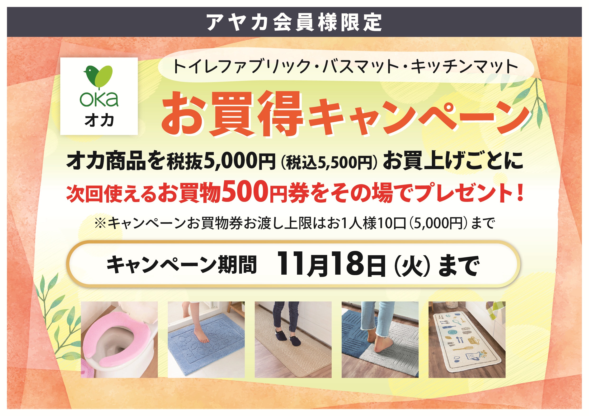 期間中に各店での1日のお買物で【オカ】製品を合計5,000円(税込5,500円)お買上げごとに、